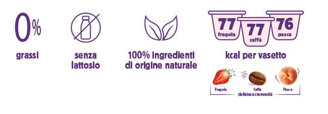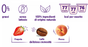 Ingredienti Pesca: Yogurt magro delattosato, preparato di pesca 10% (zucchero, purea di pesca 30%, addensante: amido di tapioca; concentrato di carota e zucca, succo di limone concentrato, aroma naturale di pesca, edulcorante: glicosidi steviolici). |